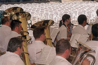 Ni una sola de las 300 sillas de plástico colocadas ordenadamente en la Plaza Nueva estaba ocupada cuando, al mediodía de ayer, la Banda Municipal abrió la celebración en Bilbao del Día Europeo de la Música con un brioso pasodoble. Una carpa protegía a los músicos y a su director, Rafael Sanz-Espert, pero al público se le ofrecía sentarse en la solana con el termómetro disparado hacia los 40 grados, así que los pocos espectadores prefirieron escuchar el concierto desde los soportales. O abanico y una caña helada para seguir poco después el programa de un cuarteto de cuerda, tangos y folclor vasco desde las terrazas que rodean la plaza, pero siempre en la sombra. "Como se les ocurra escuchar el concierto al sol, esto va a ser el día de la lipotimia", bromeaba la camarera de uno de los cafés desde el que se veía el escenario.