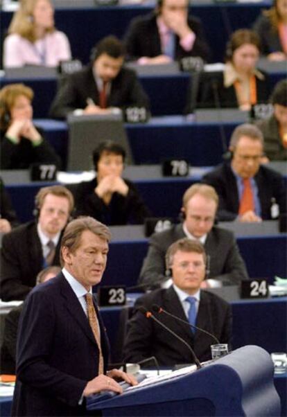 Víktor Yúshenko, presidente de Ucrania, anunció ayer en el Parlamento Europeo su propósito de entablar en 2007 negociaciones para la adhesión de su país a la UE. A su juicio, el plan Política de Vecindad, en el que Bruselas pretende contener sus relaciones con el entorno de la Unión, se queda corto cuando se trata de Kiev, porque "Ucrania es ya parte integral de Europa". Tanto para la UE como para la OTAN, a cuyas puertas también llama Yúshenko, es demasiado pronto para pensar en la integración del vecino oriental.
