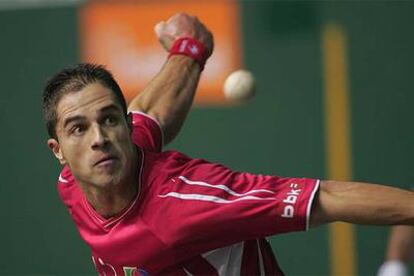 Aimar Olaizola logró ayer su tercer título en el campeonato del Cuatro y Medio tras arrollar a Xala (22-5) en la meteórica final disputada en el frontón Atano III de San Sebastián. Olaizola II no dio ninguna opción a su oponente, al que endosó siete tantos de saque y le sometió a un bombardeo de pelotazos que reflejó bien la diferencia de pegada entre ambos pelotaris. Xala, quien empezó muy mal, fue incapaz de rehacerse ante el vendaval de Olaizola II, que consiguió tantos de todas las facturas. Juego de volea, de gancho, de bote, dejaron a Xala en cinco tantos y derrotado antes de que el marcador reflejase el cartón 22 para Aimar Olaizola. En la fotografía, Olaizola se prepara para soltar un derechazo en un momento del partido.