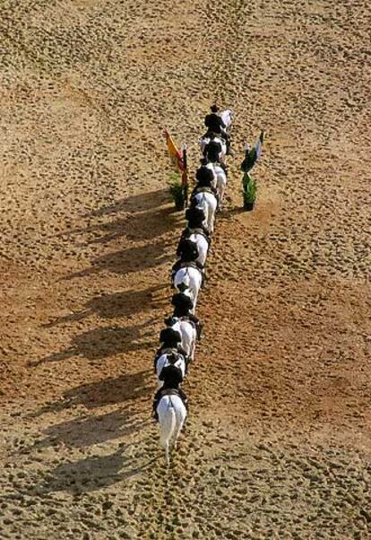 Jinetes y caballos en perfecta hilera en la escuela ecuestre gaditana de Jerez