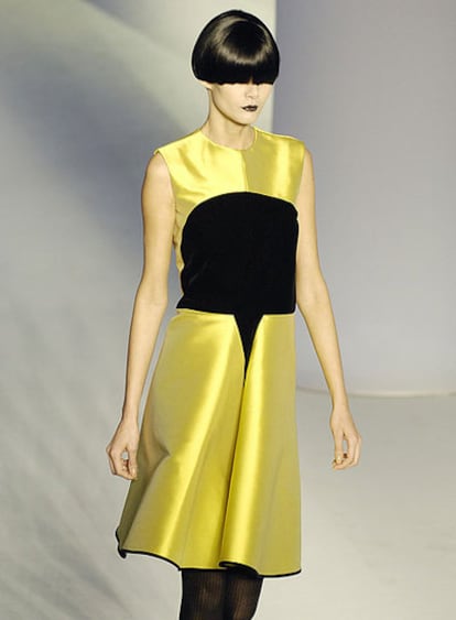 Las modelos, clonadas a fuerza de pelucas azabache y labios azul cobalto, marcharon como soldados de un futuro muy tecno. Indudablemente, autómatas derivadas del prototipo femenino acuñado por Helmut Newton. Los paneles cortados con precisión sobre un vestido de punto negro (que evocaba las gloriosas creaciones de Azzedine Alaïa) sugirieron un hiperminimalismo tan frío como seductor. Los destellos turquesa y mostaza eléctrico que asomaban en el forro de un traje sastre gris carbón o de una levita negra hablaron de rebeldía maquinera. Y los severísimos ángulos generados por seis pliegues en una americana de tafetán esmeralda confirmaron que ya no es Yves Saint Laurent de quien se trata. Tras cuatro años como director creativo de la casa francesa, el jueves Pilati ascendió por mérito propio al panteón de los popes de la moda.