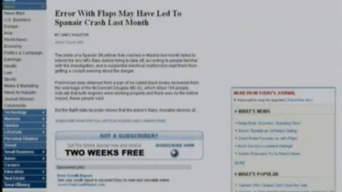 El Mc Donnell Douglas-82 accidentado en Barajas el pasado 20 de agosto trató de despegar sin los flaps, una especie de alerones imprescindibles para ganar altura. Así lo informó ayer el diario estadounidense The Wall Street Journal, citando fuentes próximas a la investigación, en la que participan expertos de EE UU. Los investigadores tratan de averiguar, según ese diario, por qué no avisó la señal de alarma de que los flaps estaban mal desplegados, algo que podría ser consecuencia de un fallo eléctrico. En el accidente del vuelo JK5022 de Spanair fallecieron 154 personas cuando la aeronave se salió de la pista al intentar despegar de Barajas hacia Gran Canaria.
