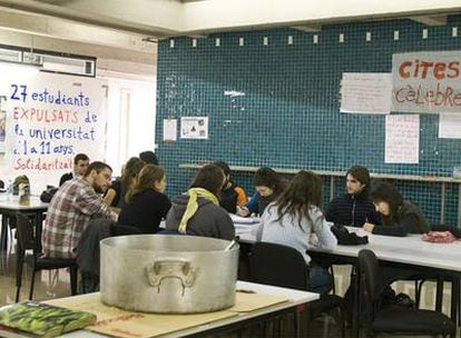 "Ahora mismo hay ya cinco facultades ocupadas: Letras, Comunicación, Psicología, Educación y Políticas, hay encierros y no se da clase, aunque en Políticas, parcialmente". Hace el recuento uno de los asamblearios de Letras, Sergi Caravaca. Los estudiantes impiden de diversas maneras que se celebren las clases, con tambores, cortando el paso al profesor... Pero en ninguna se respira un ambiente tan combativo como en Letras, facultad en la que hay unos 4.000 alumnos repartidos en sus ocho carreras. Unos profesores viven la situación, que lleva meses enconada, con tensión. Otros dicen que les entienden. El principal motivo de debate estos días en sus asambleas es la situación de los 27 alumnos que siguen expedientados y que pueden ser expulsados entre uno y 11 años de esta universidad, por hechos ocurridos el 29 y 30 de mayo pasados. Las versiones de los alumnos y del rectorado de lo que sucedió para que se les expedientara por desorden público y daños materiales coinciden en lo general, pero no en los matices.