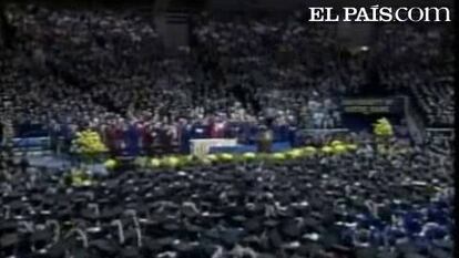 Pero aplausos y vítores recibieron al presidente de la nación, vestido con la toga azul de la institución, en la gran universidad católica del país. El presidente, el sacerdote John Jenkins, resaltó su valor al acudir a la cita. Otro la hubiera evitado, dijo. "Es un hombre que no teme hablar con los que piensan diferente", puntualizó Jenkins. Los 2.900 alumnos que acaban el curso se pusieron en pie para agradecer a Obama su presencia. Aunque el día anterior sucediese lo que todo el mundo temía. Detenciones por alteración del orden -19, entre ellas la de Norma McCorvey, la mujer conocida como Jane Roe y cuyo caso devolvió el aborto a EE UU con la histórica sentencia Roe versus Wade (apellido del juez) y que hoy ha visto la luz y lucha para que se revierta- y manifestaciones. Ayer, más manifestaciones, con hombres y mujeres arrodillados, con pancartas contra el aborto, rezando en las cercanías donde Obama tendió puentes e intentó, una vez más, aunar voluntades. Pero grandes ovaciones cuando el presidente tomó el estrado. "Debemos encontrar un camino que nos permita vivir juntos como una gran familia humana", declaró el presidente, en quizá el discurso más polémico e importante de su presidencia.
