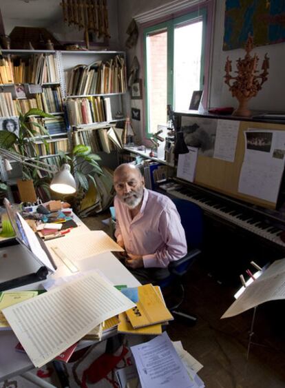 Vive y trabaja en el centro de Madrid, a pocos metros de Tirso de Molina. En su luminoso ático está su piano, una mesa con papeles y, alrededor -extendiéndose al resto del piso-, estanterías atiborradas de libros, partituras suyas y ajenas, discos de vinilo -muchos de ellos rarezas de interés casi etnográfico-, cedés, cuadros, fotos, instrumentos musicales de países lejanos y plantas. Estas últimas bastante saludables. Luis de Pablo, a punto de cumplir ochenta años, también luce un excelente estado. Sonriente y entusiasta, plenamente activo. "Todos los días procuro sentarme a trabajar, a componer", comenta. "Es ese estar dispuesto lo que te da ideas frescas y, una vez que una de ellas te sugiere algo particular, todo empieza a funcionar". Cualquier cosa puede sugerirle esa primera idea. "Suelo salir mucho a caminar por el barrio y a veces puedo oír a un chino o a un marroquí hablar con otro y se me queda en la mente algo en su voz que me interesa. Todo puede convertirse en música. Un material que logra captar su interés nunca es inerte, siempre propicia asociaciones de ideas hasta que cuajan en una composición. Si no es así, la idea no vale".