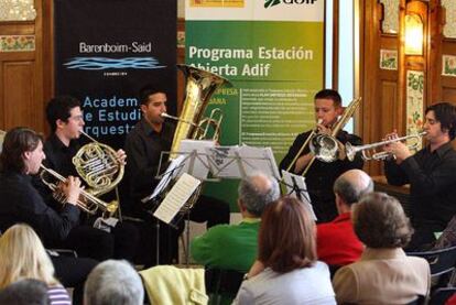 "¿Se puede entrar?", reclamaron varios al comprobar que el sonido que, a ráfagas, invadía el vestíbulo procedía del quinteto Ars Metalls, compuesto por alumnos de la Academia de Estudios Orquestales de la Fundación. La iniciativa, que ya ha pasado por las estaciones de Alicante y Cartagena, se inscribe en el convenio firmado entre Adif y la institución musical con el objetivo de hacer de las infraestructuras ferroviarias un espacio de mayor valor para la ciudadanía, como espacios de encuentro, cultura y difusión de valores. No en vano, la fundación está formada por el israelí Barenboim y el palestino Said, en una muestra de la posibilidad de entendimiento entre culturas.