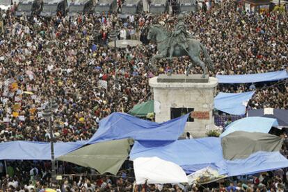 Los jóvenes agrupados en el Movimiento 15-M y concentrados en las plazas de las grandes ciudades, principalmente en Madrid, mantendrán su protesta contra la clase política y los banqueros hasta el 22 de mayo, día en que casi 35 millones de ciudadanos están llamados a las urnas. Los concentrados en Madrid desafiaron ayer la prohibición de la Junta Electoral Provincial, que denegó la autorización para la protesta en la Puerta del Sol. Miles de personas volvieron a reunirse en esa plaza ante la mirada vigilante de 500 policías que no hicieron nada por prohibir la concentración. En otras ciudades, como Valencia, la delegación regional del organismo no puso ninguna pega. Por eso, la Junta Electoral Central, integrada por ocho magistrados del Supremo y cinco catedráticos, resolverá hoy si mantiene el veto a las concentraciones, como hicieron los órganos provinciales de Madrid, Sevilla y Granada, o las autoriza, como resolvió el de Valencia.