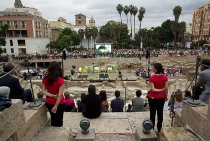 Al acto organizado ayer por el Ayuntamiento asistieron unas 500 personas, además de una cantidad similar en la calle Alcazabilla. Sobre las tablas, tres artistas malagueños -el guitarrista Daniel Casares, el barítono Carlos Álvarez y el pintor Andrés Mérida- sacaron simbólicamente del letargo al coliseo malagueño, que durante cientos de años y hasta 1951 estuvo sepultado por decenas de miles de metros cúbicos de tierra.