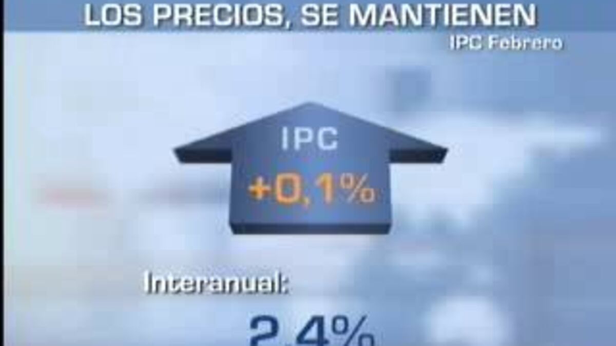 El Índice de Precios de Consumo subió el 0,1% en febrero, mientras que la tasa interanual de inflación se mantuvo en el 2,4%, según ha informado hoy el Instituto Nacional de Estadística (INE). Los precios bajaron seis décimas en los dos primeros meses del año. El INE ha publicado hoy también el Índice de Precios de Consumo Armonizado (IPCA), cuya tasa interanual fue del 2,5%, una décima más que en enero. El secretario de Estado de Economía, David Vegara, ha considerado positivo el mantenimiento de la inflación en febrero teniendo en cuenta el entorno de crecimiento y creación de empleo de la economía española. Vegara ha estimado que, de mantenerse los recientes descensos del crudo, la inflación interanual se situará "en el umbral" del 2% en los próximos meses.