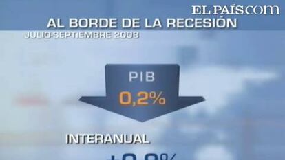 La economía española ha registrado en el tercer trimestre un retroceso del 0,2% con respecto al trimestre anterior, el primero en 15 años, debido al "significativo" debilitamiento de la demanda interna y también, en buena medida, al recrudecimiento de la crisis financiera. En su boletín de octubre, el organismo supervisor explica que esta caída intertrimestral ha hecho que el avance interanual del Producto Interior Bruto fuera sólo del 0,9%, la mitad que el registrado en el segundo trimestre y muy lejos de las últimas previsiones del Gobierno, que en verano confiaba en cerrar el ejercicio con un alza del 1,6% y descartaba por completo la posibilidad de una recesión -definida como dos trimestres consecutivos a la baja- que ahora parece más cercana que nunca.