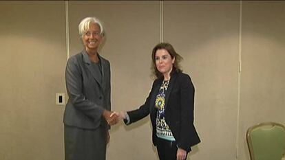 La presencia de Sáenz de Santamaría en esta capital había despertado gran interés al coincidir con un momento particularmente difícil para España en los mercados internacionales, lo que ha acelerado el debate sobre una posible acción de rescate por parte de la Unión Europa y del FMI. Lagarde comentó, tras su encuentro con la vicepresidenta española, que “no se ha recibido ninguna solicitud” de las autoridades españolas en ese sentido ni “el Fondo está haciendo ningún trabajo en relación con ningún apoyo financiero” a España. La directora del FMI trató de desmentir así una información del diario The Wall Street Journal según la cual los responsables de ese organismo internacional habían impartido ya instrucciones para trabajar en un próximo rescate de España.