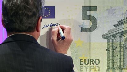 “Permítanme firmar el primer billete de cinco euros de la serie Europa”. Rotulador (y sonrisa) en ristre, Mario Draghi, el presidente del Banco Central Europeo (BCE), validó este jueves así el nuevo billete, en el Museo Arqueológico de Fráncfort, que arropa el evento con la exposición La nueva cara del euro.