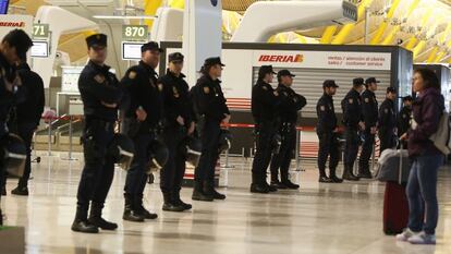 De momento, este martes la tranquilidad está siendo la tónica general en los aeropuertos españoles, también en Barajas, a pesar del fuerte dispositivo policial instalado para evitar que se repitan los incidentes de ayer. A partir de las 11.30, unos doscientos trabajadores de la aerolínea se han vuelto a concentrar de forma espontánea en el interior del edificio durante un par de horas, pero no se han registrado incidentes ante la abundante presencia de agentes en la Terminal 4, a donde se han desplazado una treintena de furgonetas.