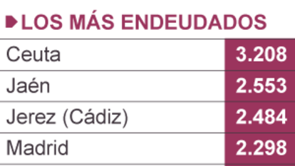 Un vistazo a Ayuntamientos más poblados revela que Andalucía es la comunidad autónoma que tiene los municipios con más deuda por habitante de España, según la estadística de deuda vida de las entidades locales difundido el pasado miércoles por el Ministerio de Hacienda. De los 50 municipios de España de más de 50.000 habitantes, 16 son andaluces. Jaén, con una deuda per cápita de 2.553 euros y Jerez de la Frontera (2.484 euros) están en el podio que tiene el dudoso honor de encabezar Ceuta (3.208 euros). Andalucía cuenta con el 20% de los municipios más poblados de España [de más de 50.000 habitantes] pero acumula el 30% de los Ayuntamientos con más deuda por habitante. En la lista de localidades más endeudadas también figuran ciudades andaluzas como El Ejido (2.235 euros por habitante), Benalmádena (2.084 euros) Cádiz (1.607 euros), Algeciras (1.422 euros) el Puerto de Santa María (1.396 euros) o Málaga (1.318 euros).