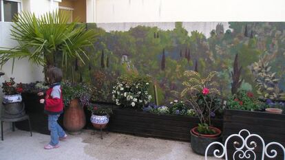 Contra los muros blancos se ha empleado la técnica del mural, que permite recrear un paisaje frondoso; para conseguir intimidad se han puesto dos grandes sombrillas, ya que no se puede atornillar un toldo y, a falta de una tierra fértil, jardineras y macetas.