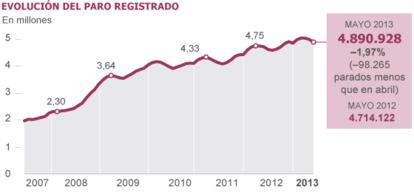 En mayo se creó empleo y bajó el paro. Una noticia esperada. El fin de semana lo había apuntado el presidente del Gobierno, Mariano Rajoy, cuando habló de un dato “esperanzador”. Ahora, lo que no se esperaba, en plena recesión, es el mejor mayo de la serie histórica con una bajada del paro registrado, 98.265 inscritos menos en las oficinas de empleo, y un dato de afiliación a la Seguridad Social inédito desde 2007 al subir en 134.600 los cotizantes. Todo un alivio que dejó la cifra de total de desempleados en 4,8 millones, un 3,75% más que en el mismo mes de 2012, y la de afiliados en 16,3 millones, un 3,7% menos.