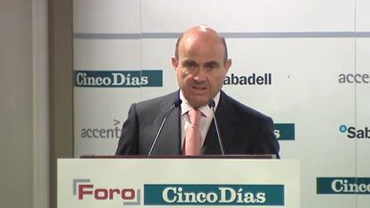 "Vivimos tiempos difíciles", ha señalado el ministro de Economía y Competitividad, Luis de Guindos, esta mañana en el Foro Cinco Días. Pese a ello y en línea con la apuesta del Gobierno por intentar ofrecer su cara más optimista, se ha mostrado confiado en que los datos de la EPA del segundo trimestre van a ser "mucho mejores" que en el primero, cuando el paro alcanzó los 6,2 millones. "La cuestión no es ya si la economía española se va a recuperar, sino cuán intensa va a ser la recuperación", ha asegurado.
