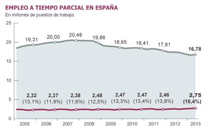 En España trabaja más que gente a tiempo parcial de lo que nunca lo ha hecho antes. Son 2,75 millones, según la última encuesta de población activa (EPA), el 16,4% de todos los ocupados. Una paradoja: en los cinco años largos de crisis el número de empleos ha caído en poco más del 18% desde máximos; en cambio, ha crecido en el mismo periodo el trabajo a tiempo parcial en poco más del 20%.