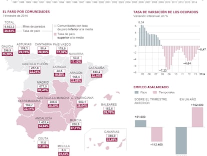 En relación al primer trimestre de 2013, el paro bajó en casi todas las comunidades y subió de forma leve en Cantabria (0,2 %) y más notable en La Rioja (3,15 %) y Galicia (3,14 %). El descenso más significativo en términos porcentuales fue el de Asturias (13,18 %), seguido por el de Extremadura (12,72 %). En cifras absolutas, el paro bajó más en Cataluña (108.800 parados menos) y Andalucía (78.300), y sólo Galicia presenta un incremento de cierta consideración (9.100 parados más).