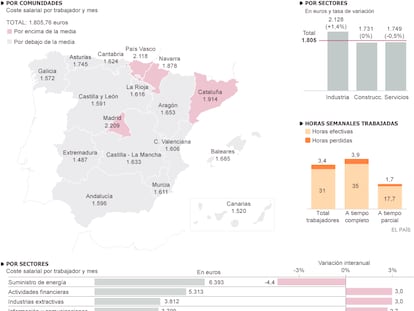La caída de salarios es igual a la del coste laboral agregado, un 0,2%. En esta partida, además de los sueldos también están las cotizaciones a la Seguridad Social y percepciones no salariales (indemnizaciones por despido o ropa de trabajo) y la suma total es de 2.474,4 euros al mes.