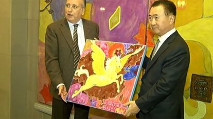 España está en el tablero. Wang Jianlin encabeza una tendencia: en todo 2013 los inversores asiáticos gastaron 50 millones de euros en España; solo en el primer semestre de 2014, ya llevan invertidos 368 millones. Aunque la visita de Wang era en principio para visitar a los 60 niños chinos que el Proyecto Wanda tiene becados en las academias del Atlético de Madrid, el Valencia y el Villareal, fueron cuatro días con agenda de jefe de Estado. Dos de ellos ni siquiera cenó; no hubo tiempo. Además de repartir orgullosas palmaditas e interesarse por lo que comían y cómo entrenaban los niños de los tres clubes, vio dos partidos de fútbol, comió paella y jamón, y disfrutó de un espectáculo flamenco. El Valencia le agasajó con un tifo con su logo y el presidente del Villareal, Fernando Roig (dueño de la cerámica Pamesa y del 11% de Mercadona), le regaló un cuadro de su esposa, Elena Negueroles, en el que aparece un caballo alado amarillo con una estrella roja en la cabeza.