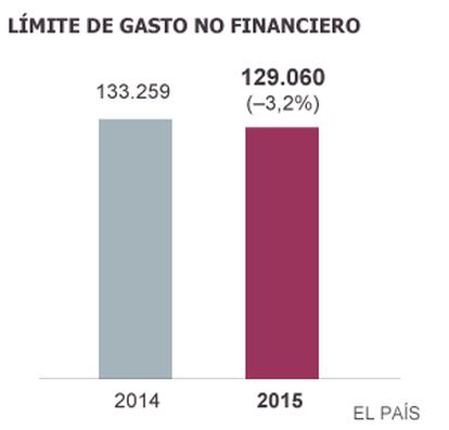 El Gobierno ha aprobado el primer recorte en el techo de gasto del Estado desde que el PP llegó al poder a finales de 2011 y con las cuentas de 2012 ya avanzadas por el anterior Ejecutivo. Así, tras aumentar el desembolso en 2013 y 2014 por la escalada de los costes de financiación y el persistente auge del paro, el Consejo de Ministros ha rebajado en un 3,2% el límite de gasto para 2015, hasta los 129.060 millones de euros. Con esta cifra, que es el primer paso y sirve de base para elaborar el presupuesto del próximo ejercicio, el gabinete de Mariano Rajoy confía en alcanzar el objetivo de déficit, fijado en el 4,2% del PIB para el conjunto de las Administraciones y en el 2,9% para la Administración central.