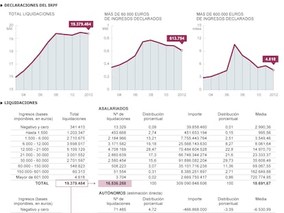 La estadística de declarantes del impuesto sobre la renta permite otro acercamiento al impacto de la devaluación salarial, uno de los legados de la crisis económica, y las medidas adoptadas para afrontarla. Otros indicadores ya habían evidenciado que en 2012, año en el que se sumó la segunda recesión en un lustro con medidas del Gobierno, como la reforma laboral y la supresión de la paga de los funcionarios, se registró un importante deterioro de los salarios. Y el IRPF corrobora esa conclusión.