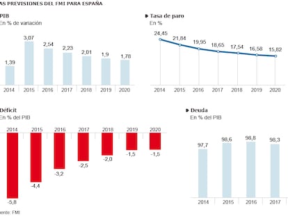 Las proyecciones del Fondo alejan hasta 2017 cuando España rebajará su déficit por debajo del 3%, el nivel por debajo del cual saldrá del Procedimiento de Déficit Excesivo impuesto por Bruselas