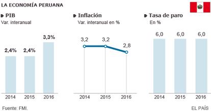 La nueva previsión del Fondo, divulgada este martes en la capital peruana, atribuye a la economía peruana un avance para este año del 2,4%, el mismo que registró en 2014, muy similar al de sus socios de la Alianza del Pacífico (Colombia, Chile o México), situación que contrasta con el desplome de Venezuela (-10%), la recesión brasileña (-3%) o el estancamiento argentino. Pero es también un avance mucho más débil que lo que vaticinaba el propio FMI hace seis meses, cuando predijo un crecimiento del 3,8% para 2015.