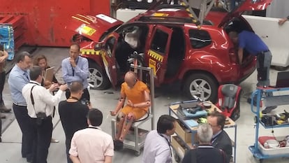 El sonido de una intensa sirena silencia al medio centenar de personas que aguarda expectante el impacto frontal de un Renault Duster rojo. Arrastrado por un correaje subterráneo, el vehículo acelera hasta alcanzar los 64 kilómetros por hora e impacta, 10 segundos después, contra un bloque de aluminio anclado al final de la pista. El automóvil rebota. El golpe seco resuena en la sala. Y los muñecos (dummies) colocados en los asientos se contorsionan, mientras las cámaras apostadas alrededor captan cada movimiento.