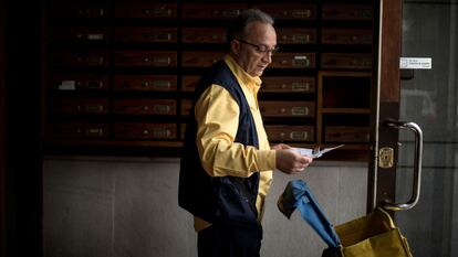 La suela de goma del náutico empieza a gastarse por el interior del talón izquierdo y la piel azul de la punta se deforma levemente con la presión de los dedos a cada paso. Cuando sucede —y eso que Juan cuida muchísimo sus zapatos de trabajo— sabe que han pasado unos dos años y 3.600 kilómetros recorriendo una decena de calles del distrito 18 de Barcelona con su carro amarillo. Su abuelo fue cartero en un pueblo de Almería y su padre heredó el oficio en Santa Coloma. Él empezó en esa época clasificando cartas en su cama todas las navidades, y a los 21 años se echó a la calle. Los Tamayo son toda una estirpe de tres generaciones en Correos. Pero se acabó. A Juan no le gustaría que su hijo, ahora en paro, siguiese con la tradición. “El futuro es incierto y de esto solamente no se vive”, explica mientras empuja su carro amarillo calle abajo y enseña la suela gastada de sus zapatos. El futuro habla de drones, carros eléctricos e infinidad de paquetes. Es eso, o la desaparición.