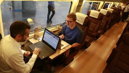 Pastor, acompañada de Cesar Alierta, presidente de Telefónica y de Pablo Vázquez, máximo responsable de Renfe, visitó el primer tren AVE, de la línea Madrid-Sevilla, en el que se puede acceder vía wifi a Internet, aún en pruebas. Telefónica y Renfe cuentan con comenzar en noviembre la instalación de la solución tecnológica que permite la conectividad a bordo en todos los trenes s-100 que actualmente cubren el servicio AVE en ese corredor.