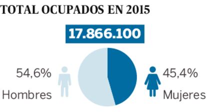 Así, el INE señala que de los 17,8 millones de asalariados de España, 12.486.000 se clasifican como “empleados con jefes pero sin subordinados", un 69,9% del total (un 68,8% en 2014). De ellos, 6.270.000, un 50,2%, son mujeres, frente a 6.216.100 hombres. Es decir, en números absolutos la paridad es casi total. No obstante, si atendemos al porcentaje de empleados sobre el total de trabajadores, se observa que las empleadas suponen un 77% del total de mujeres con trabajo, mientras que el porcentaje de hombres en esta categoría es del 63,7%. Por tanto, la diferencia está en las categorías superiores: hay más jefes que jefas.