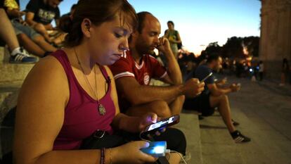 José Antonio Jaén, de 43 años, mira concentrado la pantalla de su móvil, que está conectado a una batería portátil. Está sentado en las escaleras del monumento a Alfonso XII, el conjunto escultórico que corona el estanque de El Retiro que se ha convertido en el sitio predilecto de los jugadores de Pokémon Go en Madrid por la cantidad de criaturas que allí aparecen. Él también está jugando y señala a su hijo de 10 años, sentado a su lado, como el culpable de su nueva afición. “Antes la batería me duraba casi todo el día y cuando empezamos a jugar no nos duraba ni la mitad de la jornada. Mi hijo el mayor nos compró una batería externa y ahora nos dura toda la jornada”.