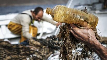 La red del San Pedro se abre y dos pescadores esparcen el contenido. Hay sardinas aleteando, pececillos brincando y calamares que mueven los tentáculos. Pero sobresale una lata oxidada con la tapa medio abierta. Dentro, enroscado, hay un pulpo moribundo. Y entre los peces emergen botes de refresco, garrafas, yogures, envoltorios, cuerdas, vidrios, tapones y corchos. Y plástico, mucho plástico. "Sacamos casi más basura que peces", dice con retranca José Ignacio Llorca, patrón mayor de la Cofradía de Pescadores de Vila Joiosa (Alicante), enseñando una botella de agua que podría ser un fósil. "Y a veces nos encontramos hasta contenedores o lavadoras, fíjate tú".