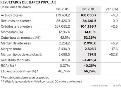 El Popular registró en 2016 las mayores pérdidas de su historia: 3.485,36 millones. Destinó 5.692 millones a provisiones para cubrir la depreciación de los activos inmobiliarios y para la devolución de las cláusulas suelo. El presidente, Ángel Ron, dejará el cargo el 20 de febrero, tras 14 años al mando, periodo en el que la cotización ha caído un 90%. Ron responsabilizó ayer de la crisis del banco a la depreciación inmobiliaria, los bajos tipos, la sobrerregulación, la competencia desleal de bancos con ayudas del Estado y los ataques de la Justicia. No hubo autocrítica: "Me voy con la tranquilidad del deber cumplido".