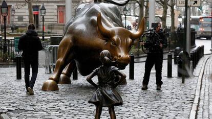 Con los brazos en jarra y la coleta al viento, una niña menuda mira desafiante desde el martes al imponente toro de Wall Street en Nueva York, un mastodonte de cara furiosa y tres toneladas de peso que simboliza el empuje del mayor mercado de capitales del mundo. El contraste entre una y otra figura de bronce ha brindado la que será una de las imágenes más poderosas del Día Internacional de la Mujer, en uno de los lugares, además, más fotografiados por turistas.