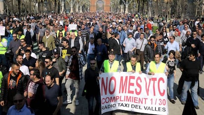"Reivindicamos que se cumpla la proporción de una licencia VTC por cada 30 taxis que marca la actual ley de ordenación del transporte terrestre, y pedimos que no se concedan las 3.000 licencias de VTC que ahora mismo están en los tribunales, ya que sería un gran perjuicio para los taxistas y para los usuarios", ha explicado Carlos Fernández, responsable de la sección intercomarcal de Barcelona del Sindicato de Taxis de Cataluña (STAC). La manifestación, que ha reunido a unos 2.800 huelguistas, tenía dos paradas, primero en el Parlament y más tarde en la plaza Sant Jaume. Cuando la marcha ha llegado al parque de la Ciutadella, los representantes del sector han entrado en el Parlament para expresar sus reivindicaciones a diputados de todos los partidos, una reunión que se ha alargado mientras la manifestación retomaba la marcha hacia la plaza Sant Jaume.