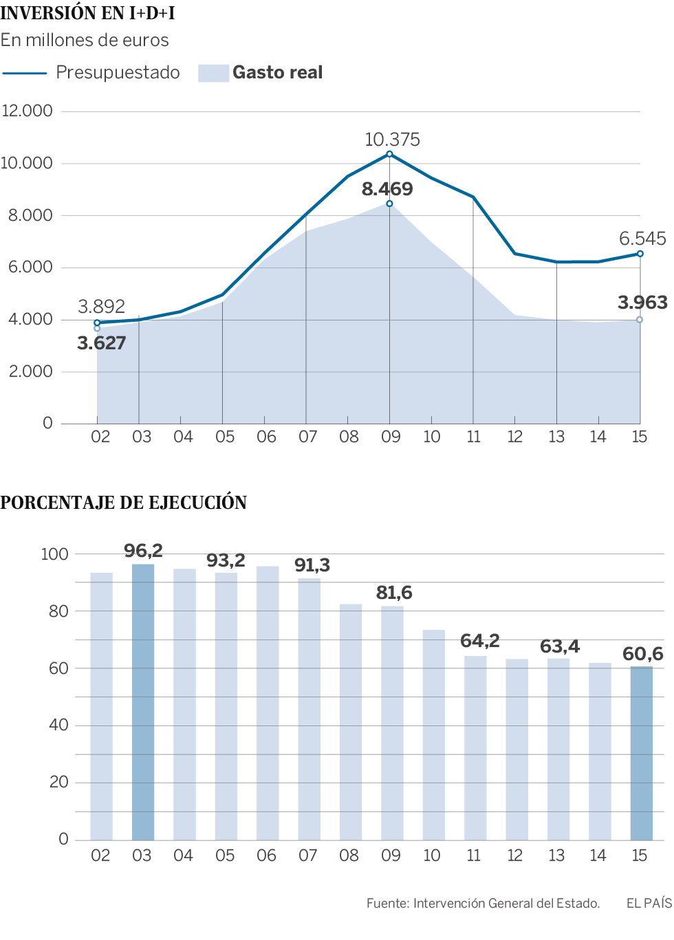 El Estado (sin contar sus organismos autónomos) solo gastó en 2015 el 51,9% de lo que presupuestó para I+D. De acuerdo con las estadísticas de la Intervención General del Estado publicadas con motivo de los Presupuestos, en la rúbrica de Investigación, Desarrollo e innovación solo se dispuso de 2.661 millones frente a los 5.128 asignados. Si también se toman las tasas de ejecución de los organismos autónomos y agencias estatales, la proporción aumenta un poco y alcanza el 60,6% del presupuesto total de la Administración General. La llamada política 46 se sitúa así en los 3.963 millones, la mitad de los 8.469 millones que se emplearon allá por el 2009.