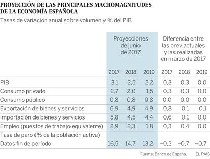 La economía española está desbordando todas las expectativas. El Banco de España se sumó este martes al grupo de instituciones y centros de análisis que revisan al alza las proyecciones sobre la economía española. Mejora en tres décimas el pronóstico que había realizado hace tres meses y elevó hasta el 3,1% su previsión de crecimiento del PIB este año y al 2,5% en 2018. También aumenta su cálculo de creación de empleo y rebaja la tasa de paro hasta el 13,2% a finales de 2019. La institución justifica los cambios por la mejoría del contexto internacional.