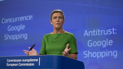 El Ejecutivo comunitario lleva siete años con las prácticas de Google bajo la lupa. Tras un primer periodo basado en la búsqueda de acuerdos —bajo el mandato de Joaquín Almunia—, Competencia cambió de estrategia. Vestager optó hace dos años por abrir un expediente sancionador referido a uno de los casos que más quejas acumulaban: la presunta discriminación que aplica Google a los competidores cuando el usuario recurre al buscador para buscar productos y comparar precios. Bruselas argumenta que la empresa fundada por Larry Page sitúa en una posición prominente sus propios servicios (Google Shopping), independientemente de su relevancia, y oculta otros de los competidores.