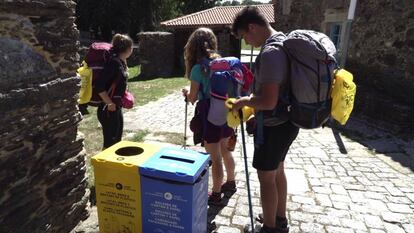 En los senderos que conducen a la tumba del apóstol Santiago el Mayor, la meta de uno de los itinerarios más populares y con más mística de Europa, relucen por doquier bolsas amarillas. Cuelgan de los macutos de los peregrinos y van llenas de botellas vacías, papeles latas y envases. Y en el exterior de los albergues, destacando entre los colores de fin de verano, brillan papeleras amarillas y azules. El despliegue forma parte de Camino del Reciclaje, un proyecto promovido por Ecoembes que, con la implicación de hospitaleros y caminantes, apunta a fomentar el reciclaje y prevenir el abandono de basuras (littering) en las distintas etapas del Camino de Santiago.