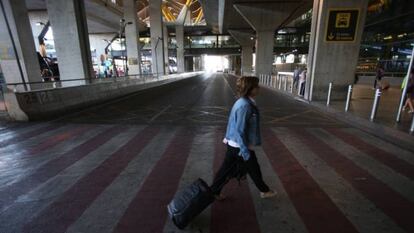 Varios viajeros, en el aeropuerto de El Prat (Barcelona), este jueves, durante la huelga de taxis. / FOTO: Alejandro García (EFE)