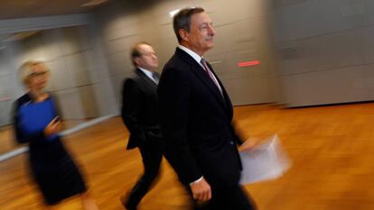 Draghi se educó con los jesuitas, y de vez en cuando lo demuestra ante la prensa: “Paciencia. Hacen falta paciencia y perseverancia”, dijo para justificar el juego de engaños que mantiene con los mercados desde hace meses. Los inversores esperaban novedades en junio, en la reunión del BCE en Sintra: Draghi decepcionó. Los mercados siguieron con atención su intervención en Jackson Hole, el aquelarre que organiza la Fed de EE UU: de nuevo, el anticlímax. Pero este jueves, por fin, preparó el terreno para el esperado repliegue de las medidas extraordinarias. El jefe del BCE admitió que ese debate ya ha empezado en Fráncfort, y anunció que recalibrará “en octubre” el QE europeo a la vista de la mejoría económica. Aunque dejó claro que retrasará una vez más la retirada si algo se tuerce: en particular, el tipo de cambio del euro.