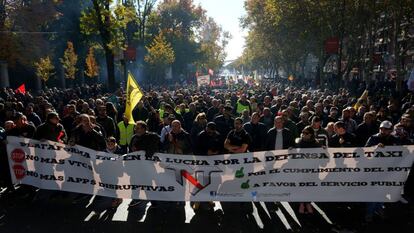 España ha pasado este miércoles sin apenas taxis en las calles por un paro de 24 horas convocado por las asociaciones del gremio contra la actividad de los Vehículos de Alquiler con Conductor que intermedian compañías como Cabify y Uber. Desde las 6.00, montarse en un taxi ha sido una tarea difícil en las grandes ciudades, excepto para los servicios mínimos en hospitales, urgencias, aeropuertos y estaciones. La Federación Española del Taxi, que representa al 70% de los taxistas con licencia, ha asegurado que el seguimiento ha sido del 100% en Madrid, con la zona de Gran Vía colapsada, en Barcelona y en el resto de grandes núcleos urbanos. En Madrid ha habido una multitudinaria manifestación que ha partido de Atocha y ha llegado a la plaza de Neptuno, donde se han vivido escenas de tensión entre manifestantes y policías, que trataban de impedir su llegada al Congreso.