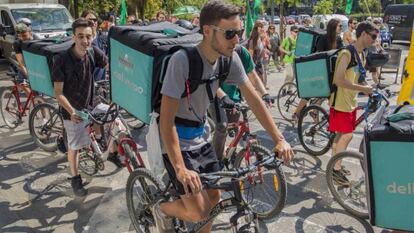 En sus anuncios, Deliveroo ofrece a los interesados 4,5 euros por cada pedido que entreguen en moto o bicicleta eléctrica y 4,25 en bicicleta normal. Les proporcionan, a cambio de un depósito de 70 euros que descuentan en el segundo mes de facturación, una batería de móvil, bolsas térmicas y la famosa caja-mochila con el logotipo de la empresa. Las plataformas se cuidan de no llamarlos “trabajadores” y utilizan términos como “colaboradores”, o crean su propia jerga (los de Glovo son Glovers, los de Deliveroo, Riders). “En España el problema que tenemos es que, cuando se oye la palabra “autónomo” se piensa en abusos. Hay serie de prejuicios que no responden a la realidad”, defiende Diana Morato, directora de Deliveroo. “Trabajamos de la forma en que nos piden. No exigimos exclusividad, ellos eligen los horarios, no tienen que darnos explicaciones si dejan de repartir, así que yo no sé con cuántos repartidores cuento mañana, o esta tarde. Además, pueden estar apuntados a varias plataformas a la vez”. La mayoría de sus riders son Trabajadores Autónomos Económicamente Dependientes (Trade), lo que significa que sus ingresos provienen, en un 75% o más, de una sola empresa.