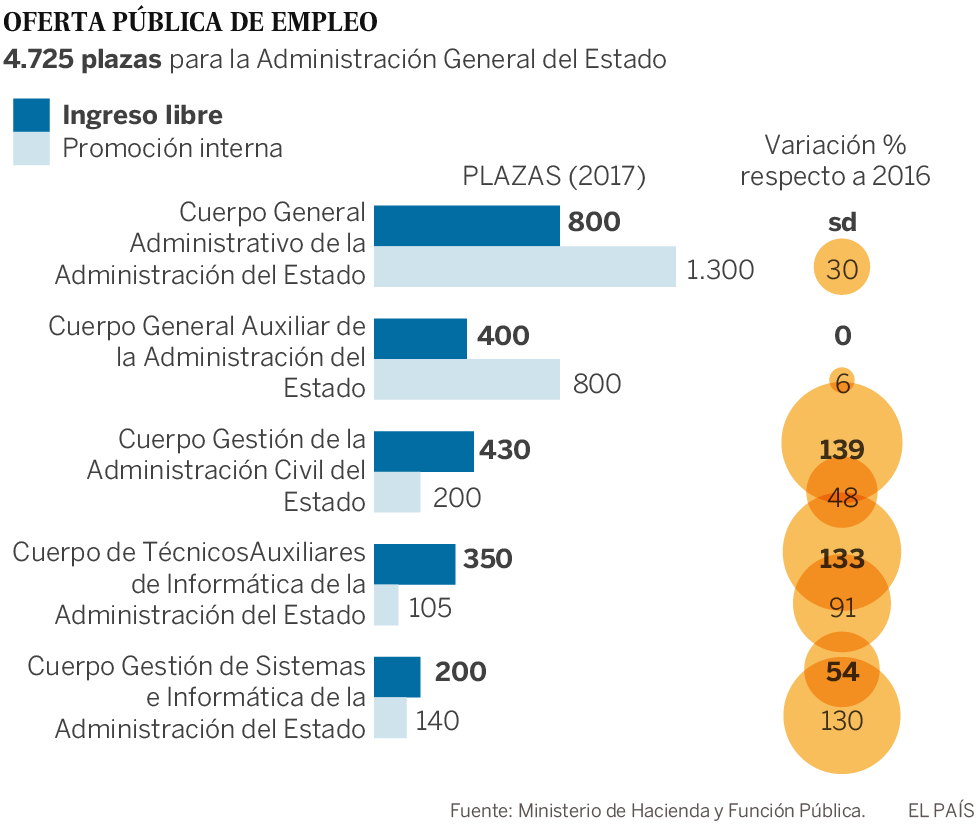 La Administración General del Estado ha convocado hoy los procesos selectivos para cubrir un total de 4.725 plazas en cuerpos generales del Estado, correspondientes a la oferta de empleo público de 2017. Algo más de la mitad de las plazas están reservadas a promoción interna. La convocatoria supone un incremento del 65% sobre las 2.867 plazas ofertadas en la anterior. "Además del importante incremento en el número de plazas convocadas, en esta Oferta de Empleo Público destaca la convocatoria de 800 plazas por el sistema de ingreso libre en el cuerpo general administrativo de la Administración del Estado. Desde 1992 no se habían vuelto a convocar por el turno libre", recuerda en una nota de prensa el Ministerio de Hacienda.