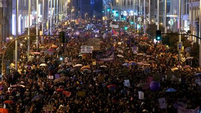Cientos de miles de personas en todo el país desfilaron bajo el color violeta que simboliza el movimiento feminista y desbordaron las calles de 120 ciudades. En Madrid se superó ampliamente la asistencia del año pasado: la Delegación del Gobierno cifró los manifestantes en 170.000 —en 2017, habló de 40.000—. Fuentes sindicales elevaron el número a un millón —500.000 personas según los organizadores en 2017—. Patricia y Virginia, dos funcionarias jubiladas, acudieron a la marcha por “crear conciencia”. “Hay que demostrar que juntas tenemos mucha fuerza”, reivindicaban ambas, informa J. A. Aunión. Entre los cánticos y gritos se escuchaban referencias al futuro: “La lucha sigue, cueste lo que cueste”. También clásicos de estas protestas como “Manolo, Manolito, hoy te cuidas tú solito”.