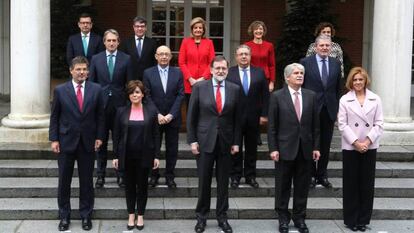 Román Escolano ya ejerce de ministro de Economía, Industria y Competitividad. Hoy ha recibido su cartera de manos de su predecesor Luis de Guindos, y ha participado en su primer consejo de ministros. El nuevo titular de Economía, hasta ahora vicepresidente del Banco Europeo de Inversiones (BEI), se ha sentado la mañana de este viernes en la reunión que celebra todo el equipo de ministros de Mariano Rajoy. Como se puede apreciar en las imágenes, Escolano se ha sentado en el puesto que hasta ahora ocupaba Guindos, al lado de Álvaro Nadal, el ministro de Energía, y enfrente de Dolors Montserrat, ministra de Sanidad. Antes de la reunión, el Gobierno en pleno se ha hecho una nueva foto de familia en las escaleras de Moncloa.