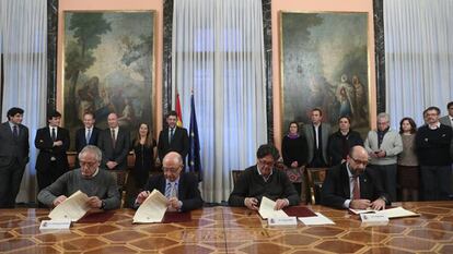 Es con los sindicatos con quien mejor ha logrado entenderse durante los 19 meses que han transcurrido desde que Rajoy estrenó este nuevo mandato. Con ellos, cerró el año pasado un acuerdo contra la temporalidad en el empleo público, por el que se convocarían oposiciones para 250.000 plazas en tres años. También pactó la subida del salario mínimo hasta los 850 euros para 2020. Y con ellos ha suscrito un acuerdo "histórico" en palabras de Montoro. "Hoy es un buen exponente de que la negociación es posible y factible por encima de las ideologías", ha remachado.
